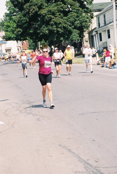 Mary approaching the finish line at the Boilermaker 15K Road Race, July 8, 2007
