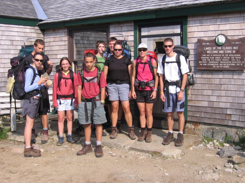 After dinner at Lakes of the Clouds AMC Hut, a short walk up Mt. Monroe, Chris, Kat, Josh, Ben, Andy, and Mary, Albert lying down on top of the rock, August 1, 2007