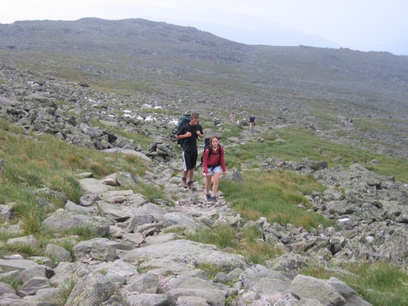 Leaving Lakes of the Clouds AMC Hut for Makison Spring AMC Hut, Josh, Mary, Kat, Albert, Ben, Chris, Suzanne, Valerie, and Andy. Jimmy, Katie, and Mark went on to accompany Dad to the summit of Mt. Washington where he took the Cog Railroad down to the base station where the car was parked. His legs can't take the sharp rocks anymore. August 2, 2007.